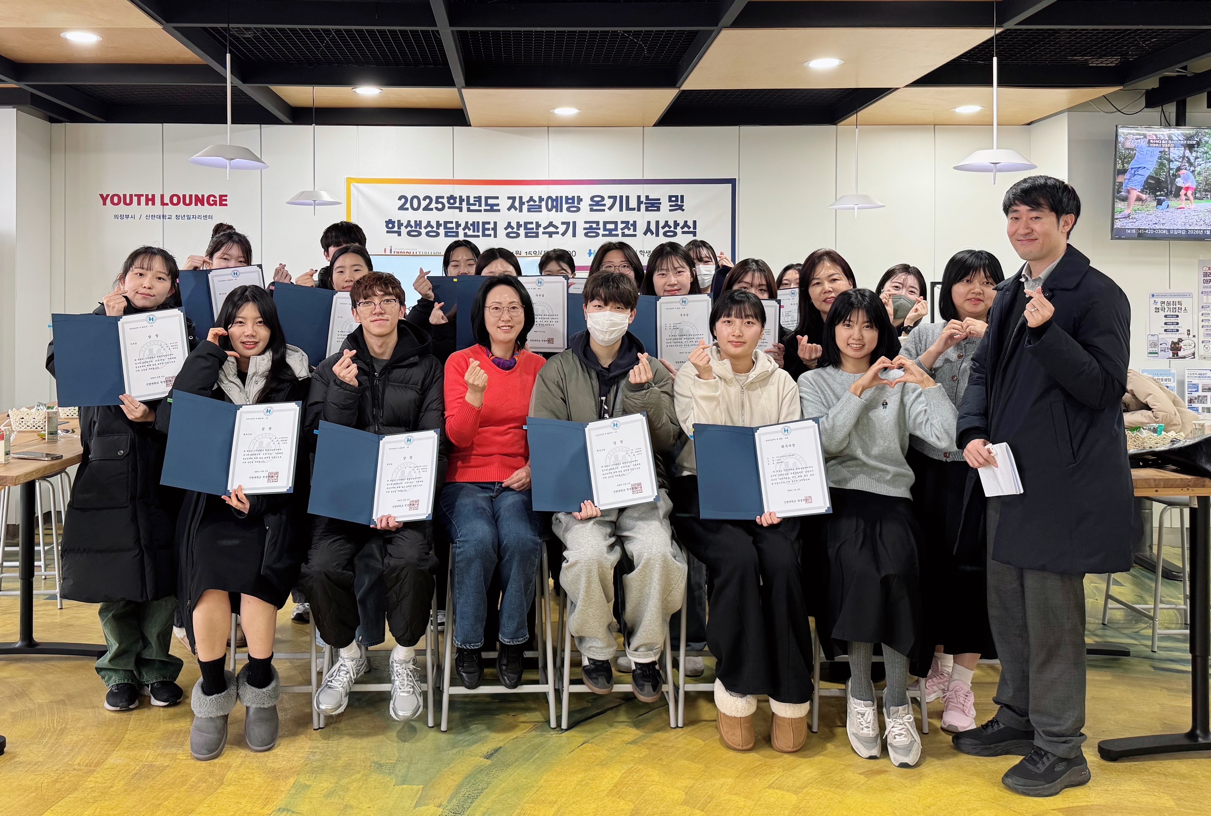 신한대학교(총장 강성종) 학생상담센터(센터장 이현종)는 2026년 1월 15일 교내에서 ‘2025학년도 자살예방 · 상담수기 공모전’을 개최했다. 이날 시상식에는 학생상담센터장을 비롯한 전임 상담원들과 공모전에 참여한 재학생 20여 명이 참석해 생명 존중과 마음 돌봄의 의미를 나누는 시간을 가졌다. 이번 행사는 ‘온기-나눔 자살예방 공모전’과 ‘나愛디딤돌 상담수기 공모전’의 우수작을 시상하고, 창의적인 아이디어와 진솔한 경험을 공유함으로써 교내 정신건강 인식 제고와 생명 존중 문화 확산을 도모하기 위해 마련됐다.